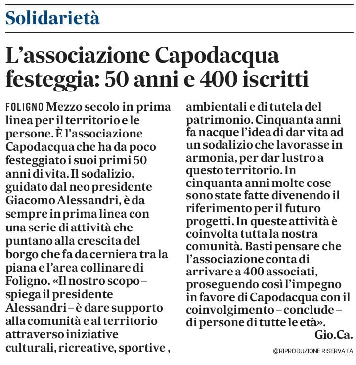 L’Associazione Capodacqua (AS.C.) costituitasi nell’agosto del 1975 e con sede legale nella frazione di Capodacqua di Foligno, è una libera associazione tra cittadini che su base volontaria e senza finalità di lucro persegue principalmente i seguenti obiettivi: